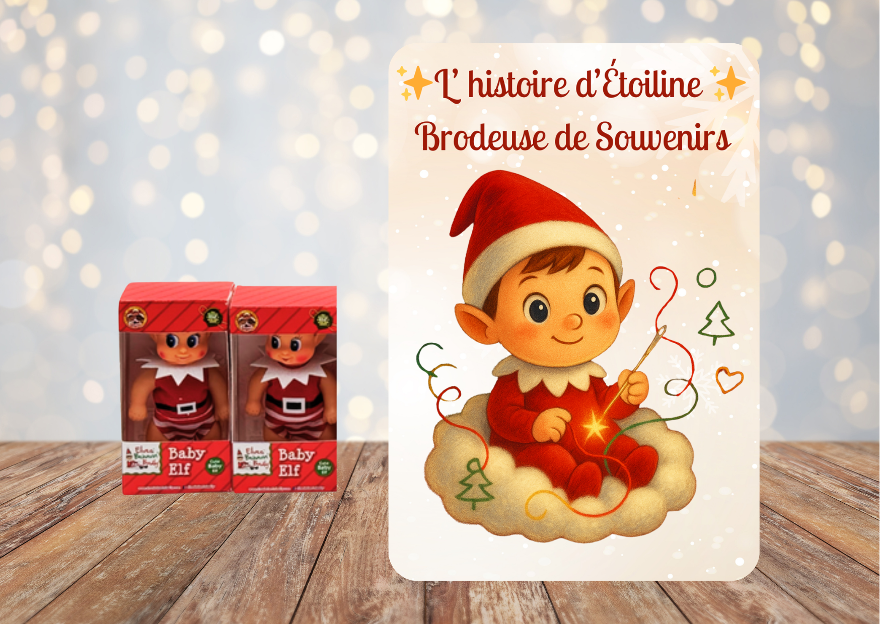 Un petit trésor venu du Nid Secret du Pôle Nord est arrivé chez vous… Son nom est Étoiline, la douce Brodeuse de Souvenirs. Trop petit pour fabriquer des jouets, ce bébé lutin a pourtant une mission essentielle : broder la mémoire de Noël grâce à l’aide des enfants 💝.