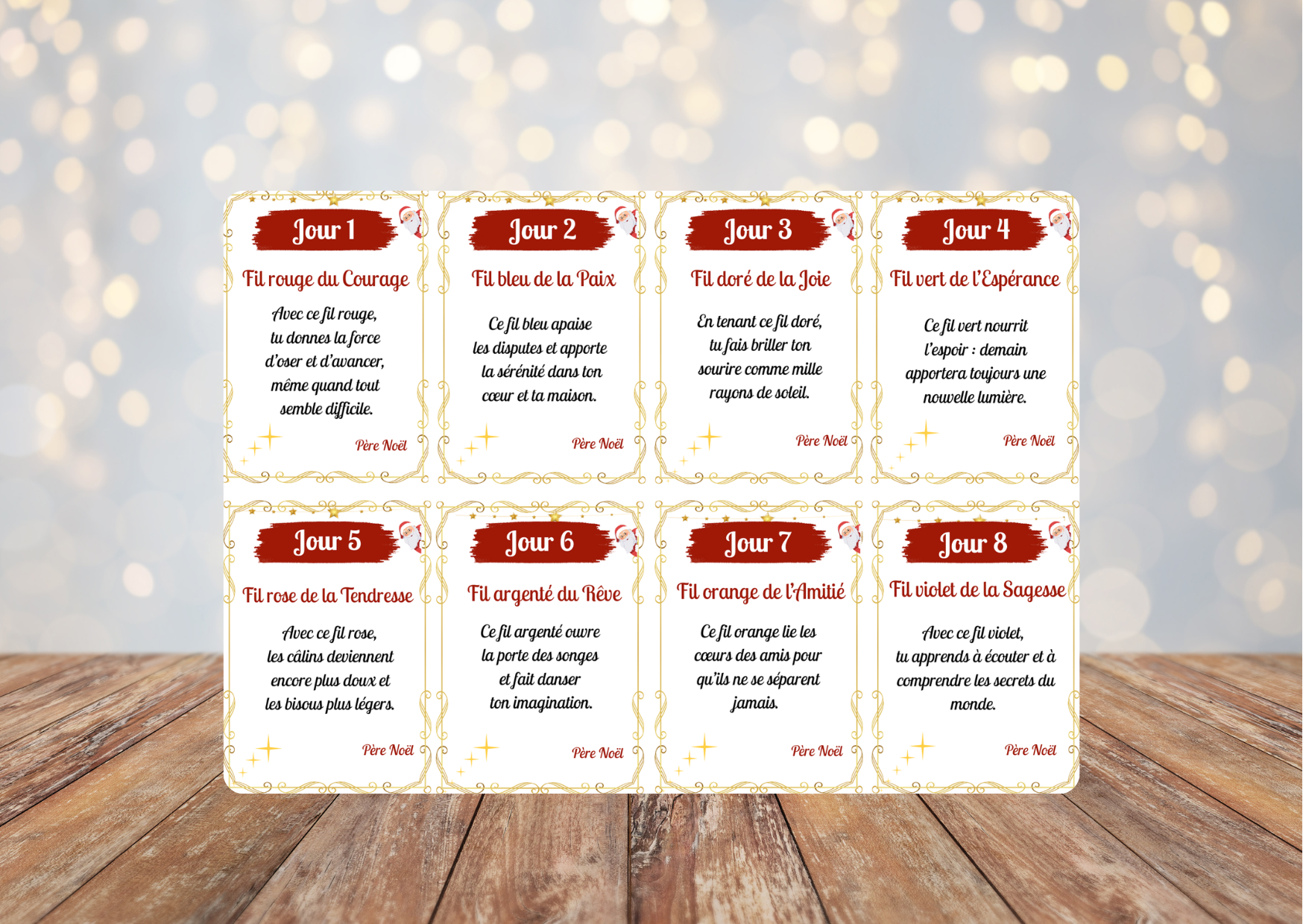 ✨ Les 24 fils magiques : Chacun porte une valeur (joie, tendresse, courage, espérance…). Chaque fil est accompagné de sa petite carte explicative féérique.
