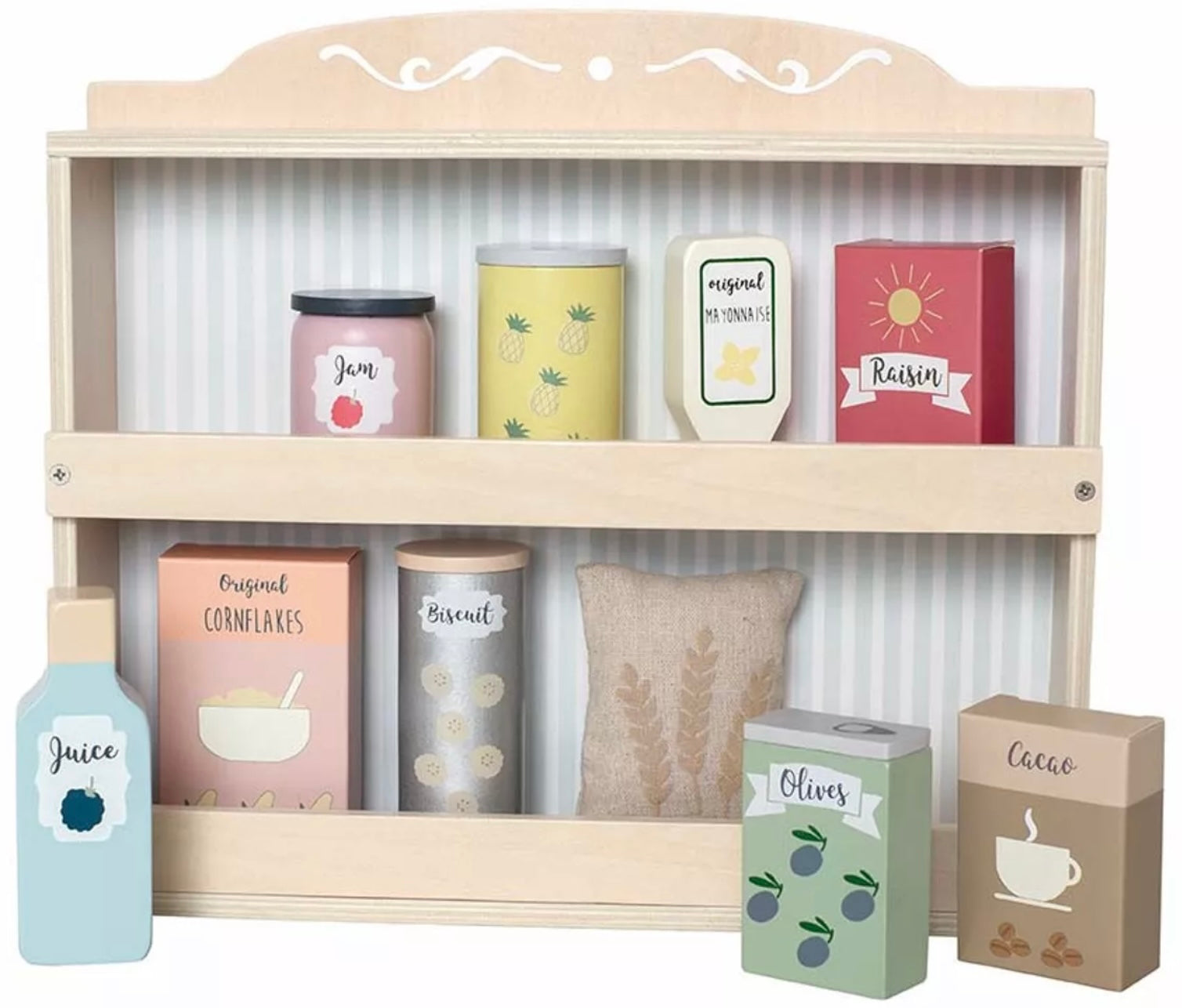 Cette étagère permet à chaque enfant de jouer à la marchande. L'étagère en bois contient les éléments suivants : une boite de chocolat, un pot de confiture, de l'ananas, un paquet de raisins, un pot de mayonnaise, un paquet de cornflakes, une boite d'olives, une bouteille de jus de fruits, un paquet de farine, une boite de biscuits.