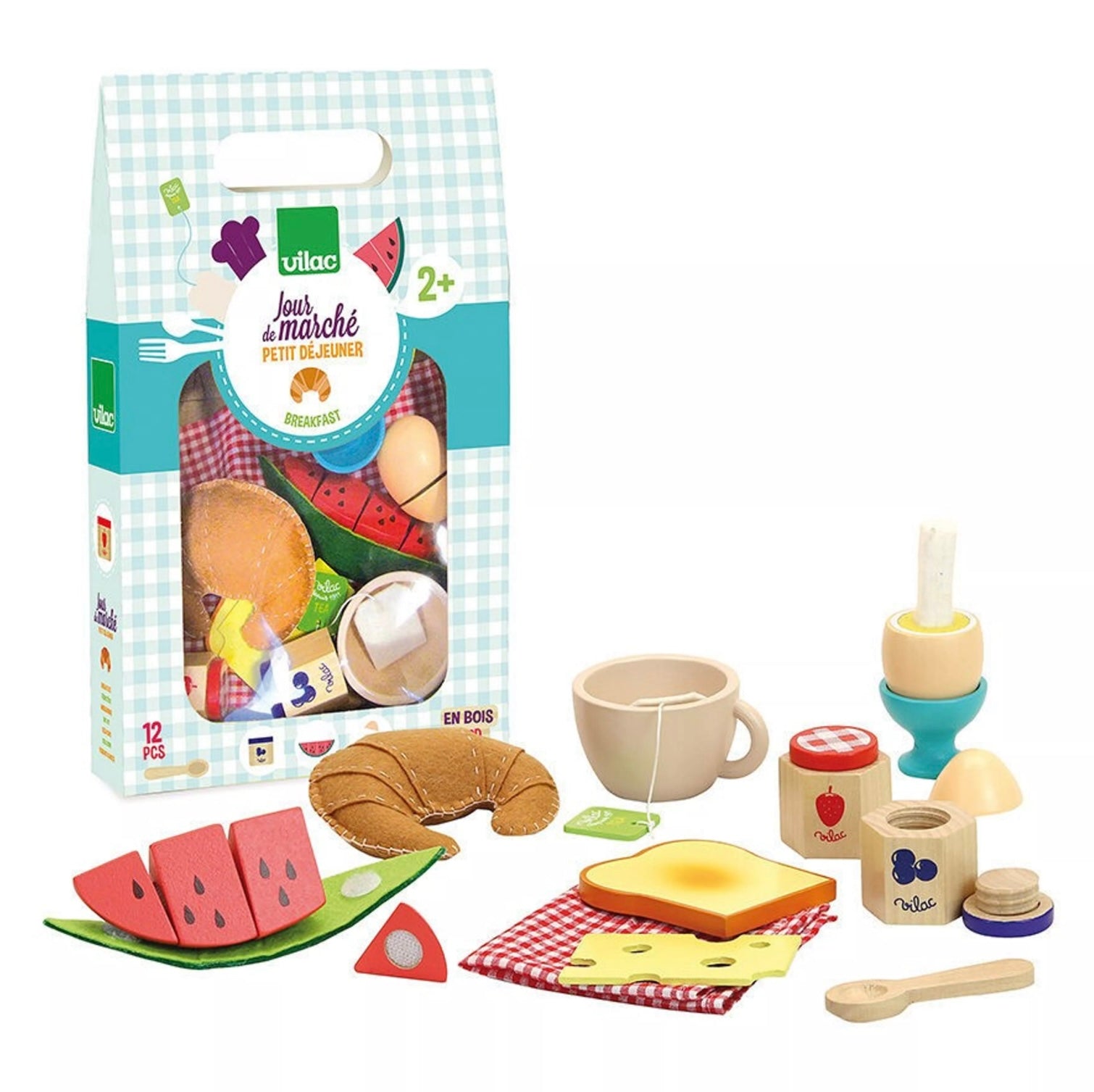 Dans la gamme Jour de Marché, retrouvez ce set petit déjeuner original avec un œuf à découper dans lequel on trempe sa mouillette, 1 tartine, du fromage, un croissant, des pots de confitures à ouvrir, 1 tasse de thé et son sachet, et une pastèque à découper... Hummmm ! Un vrai bon petit déjeuner. Éléments en bois et feutrine. Set ptit dej' 12 pièces. A partir de 2 ans.