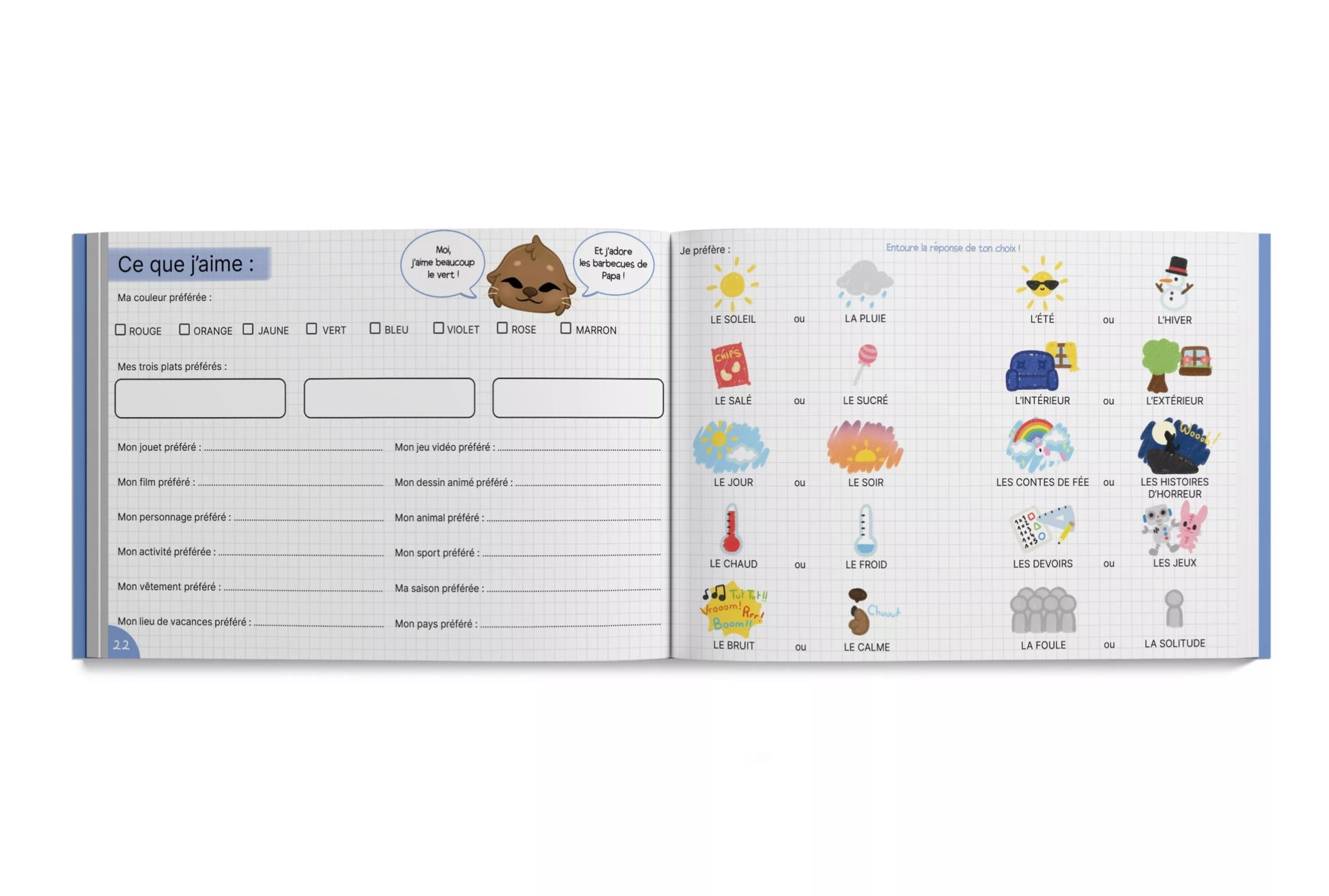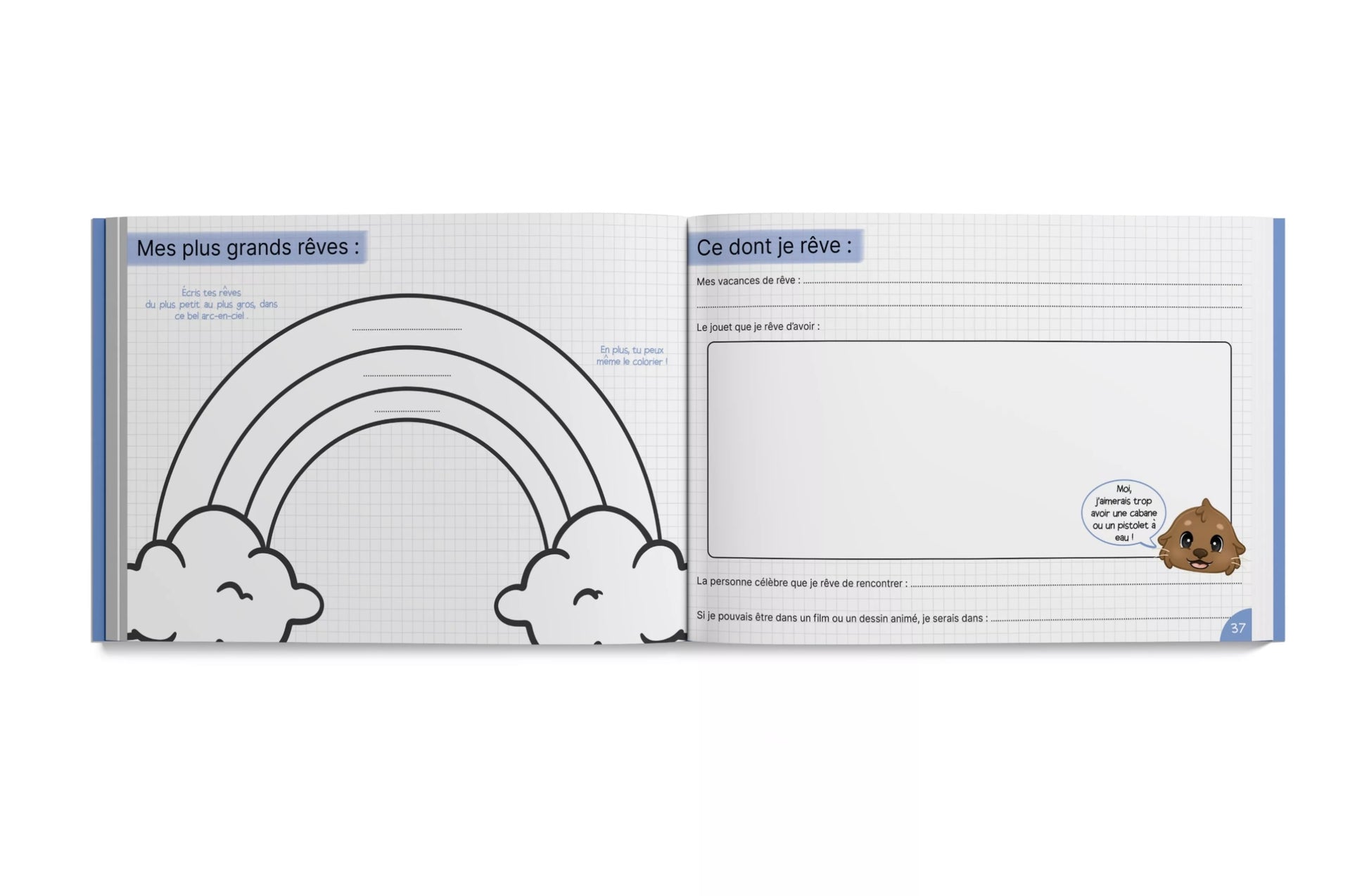 • 🎨 Des activités variées : écrire, dessiner, coller des photos, répondre à des questions libres.