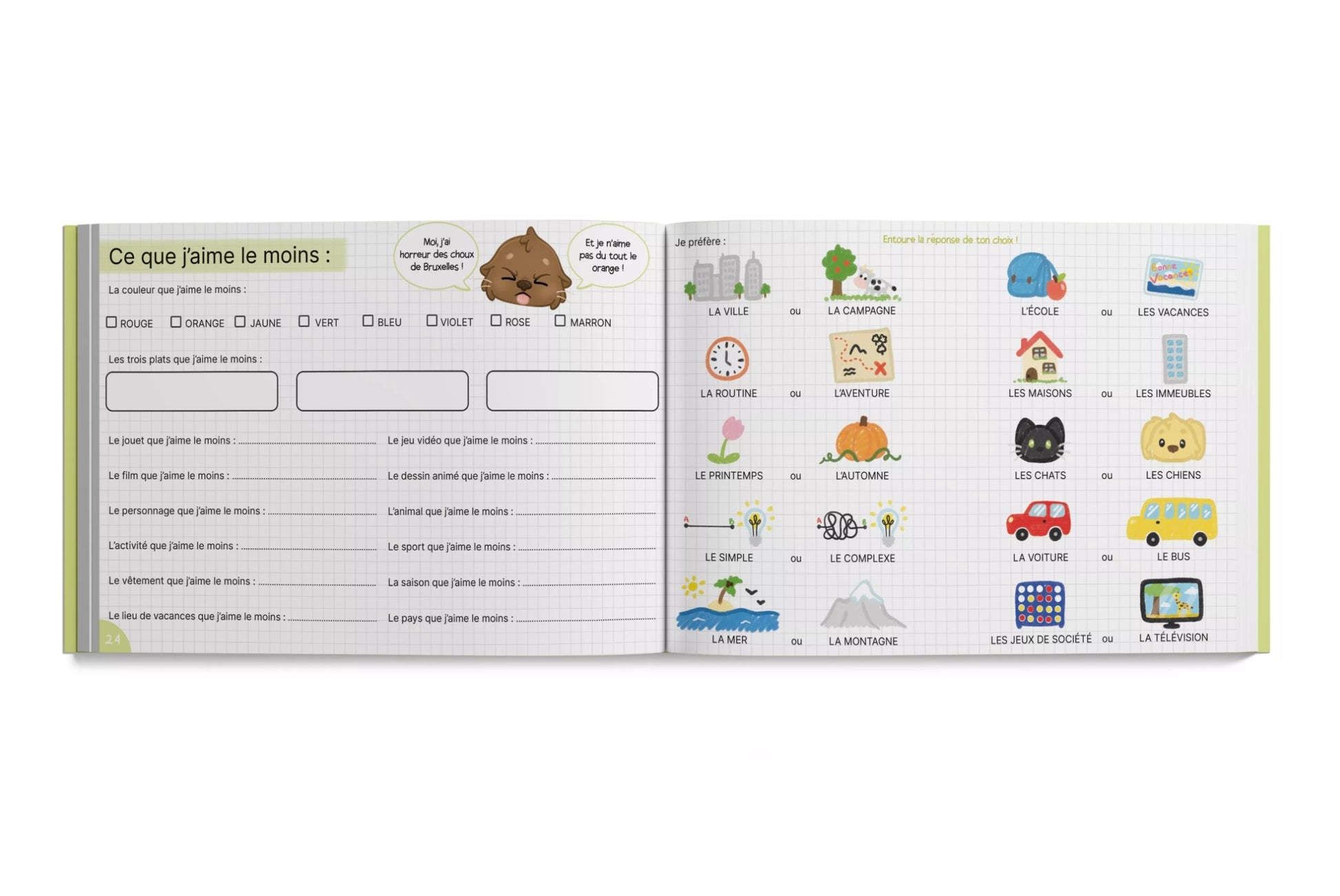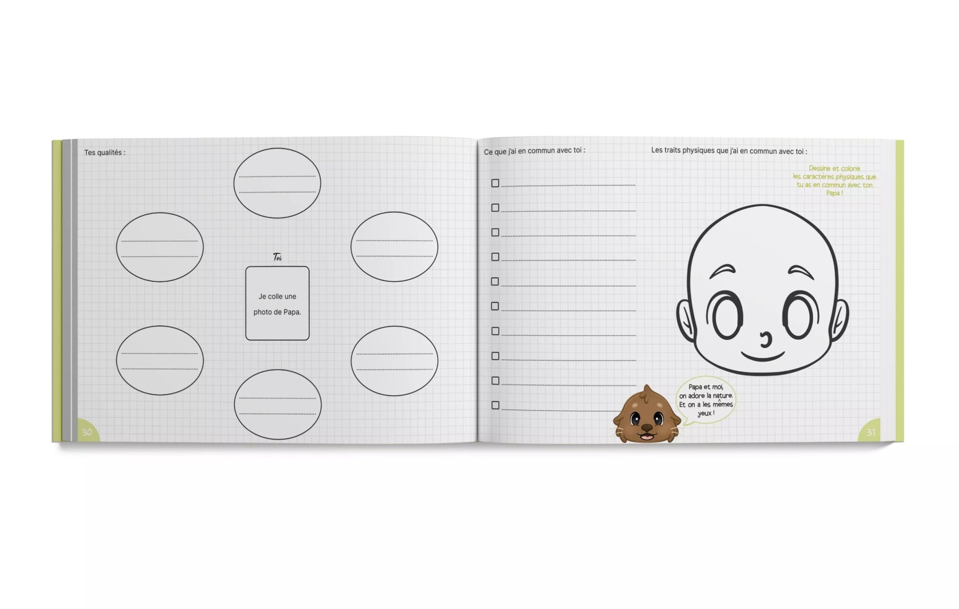 Conçu comme deux livres en un, il invite l’enfant à répondre à des questions sur son papa et sur sa maman, renforçant ainsi le lien qui l’unit à chacun d’eux.