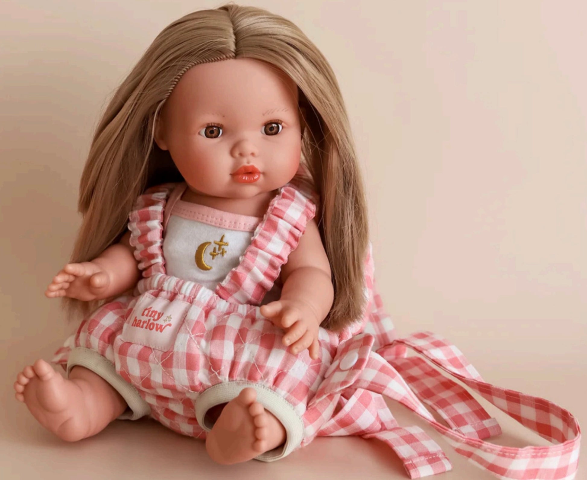 Transportez votre poupée préférée avec style et confort grâce au porte-bébé pour poupée Tiny Harlow avec motif vichy rose!