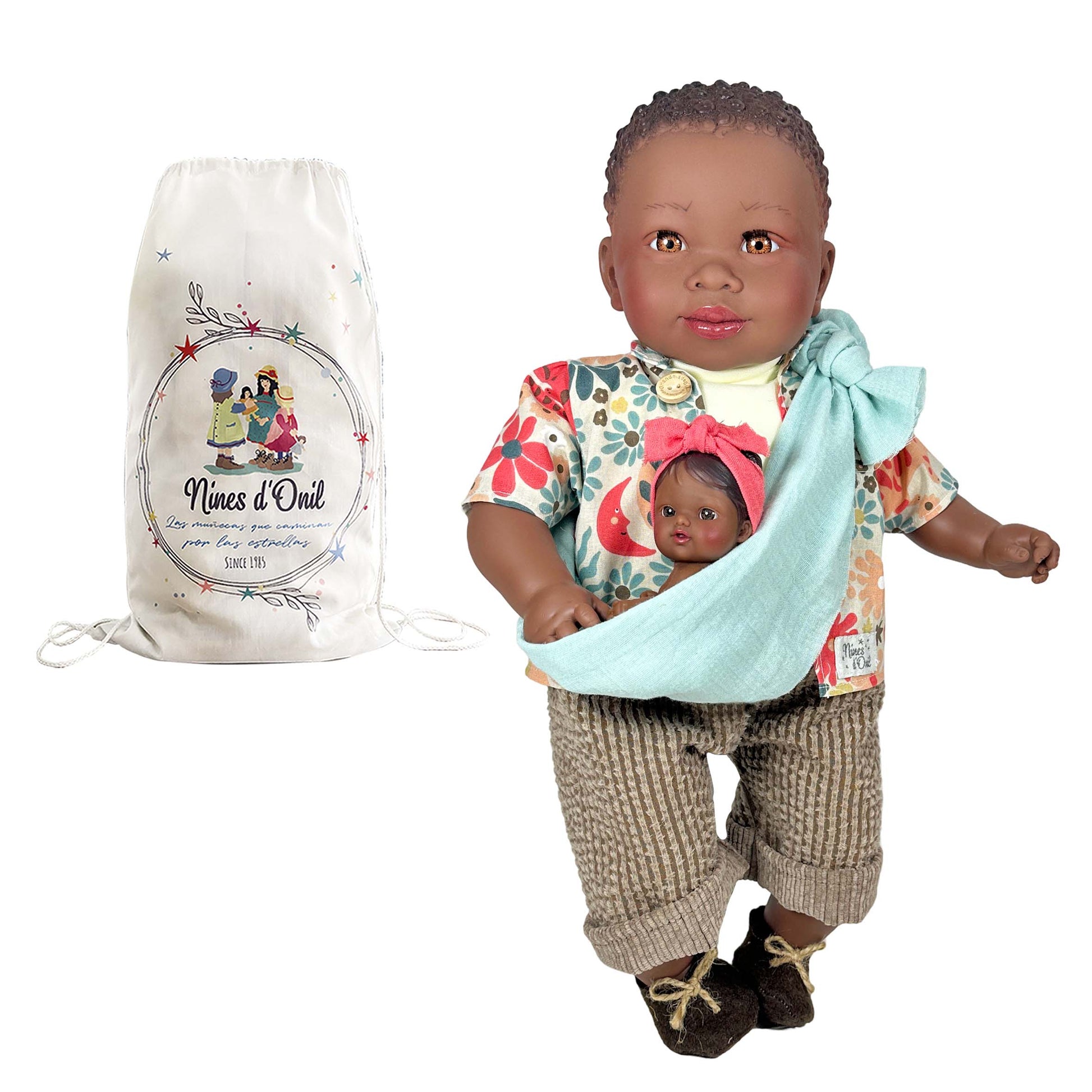 Amir avec son bébé est une poupée qui mesure 45cm. Il a des membres en vinyle et un corps souple en tissu hypoallergénique. Ce modèle a de beaux cheveux bouclés et luxuriants.