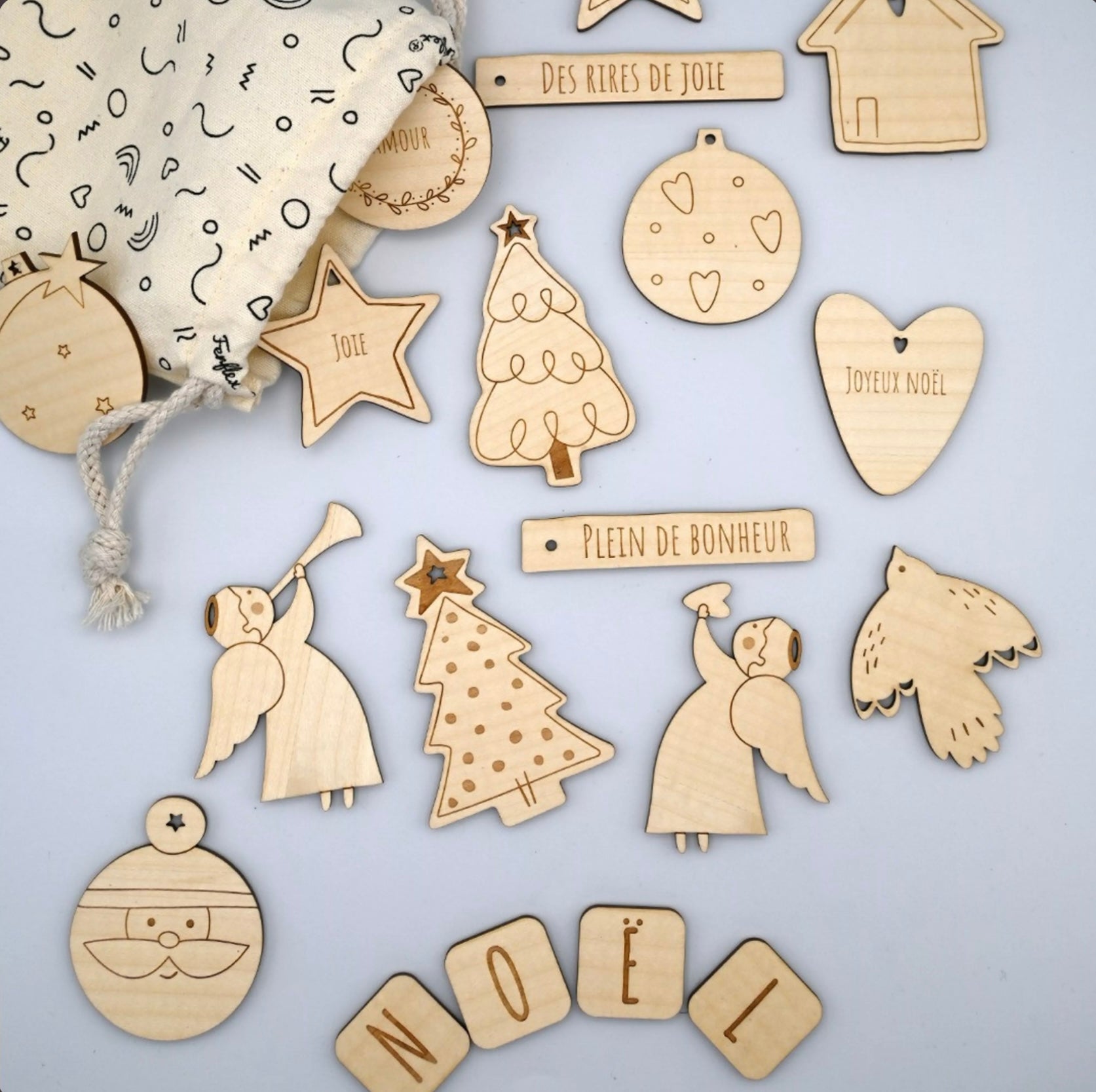 - 🎁 19 magnets en bois d’érable (épaisseur 3 mm) issus de forêts gérées durablement : boules, anges, étoiles, sapins, colombes, maison, cœur, mots d’amour…