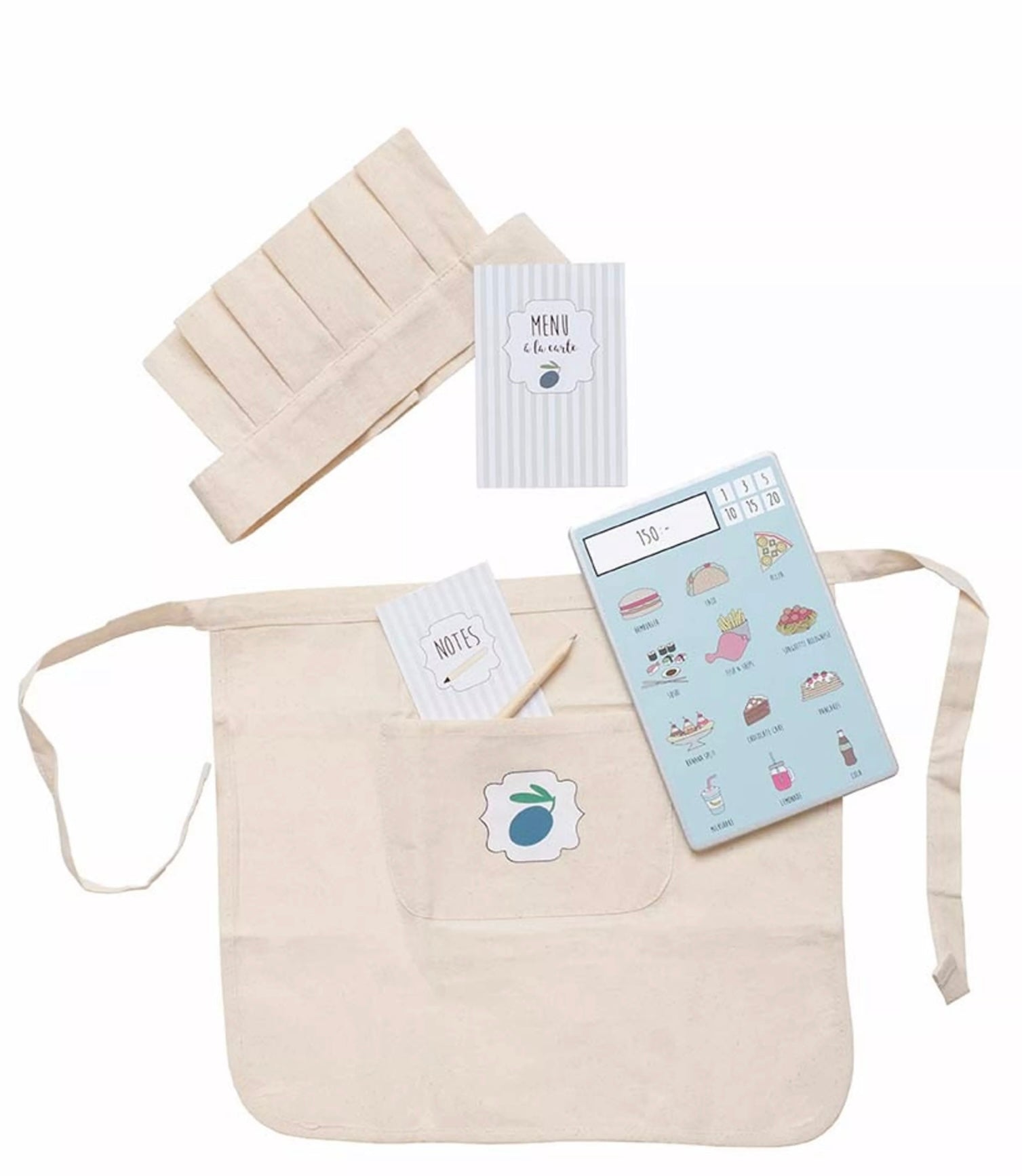 La tenue de serveur comprend un tablier, un chapeau, un menu, un stylo, un carnet et une tablette. 3+